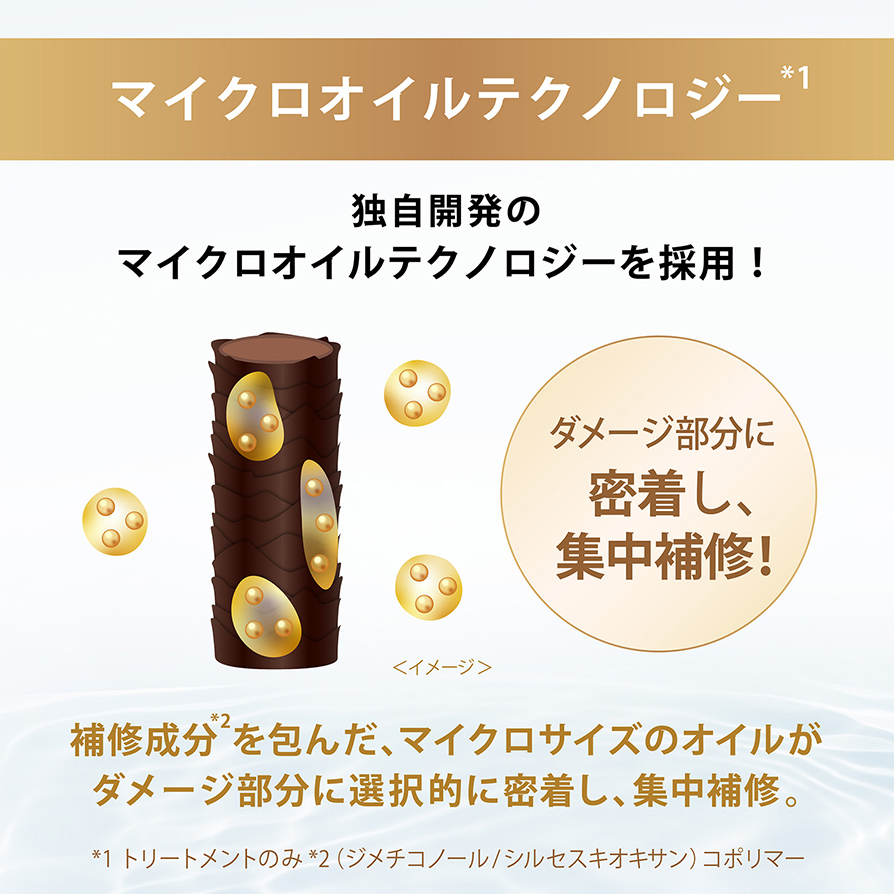 補修成分*2を含んだ、マイクロサイズのオイルがダメージ部分に選択的に密着し、集中補修。